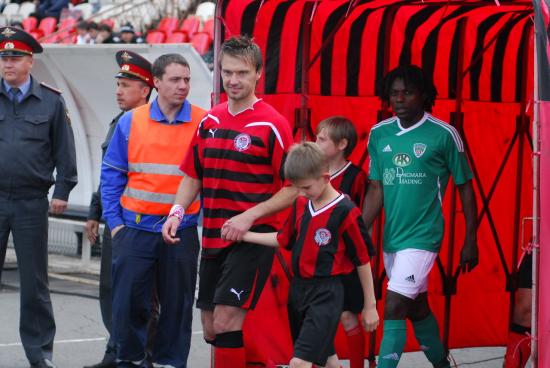 Обои Сергей Волков нападающий Амкара с юным футболистом