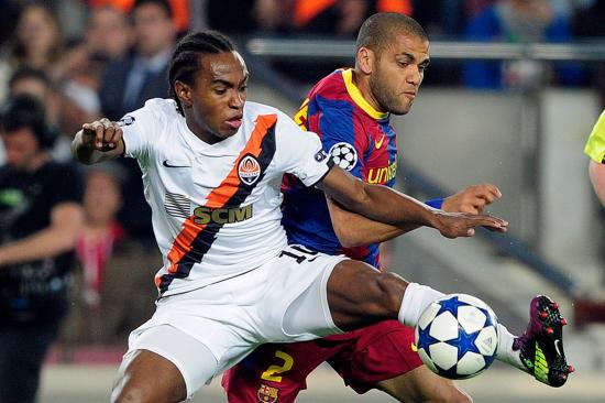 Обои Защитник Барселоны Даниэл Алвес борется за мяч