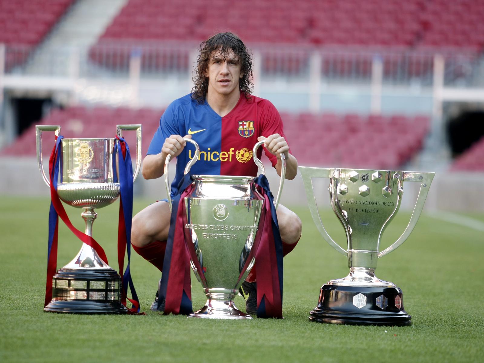 Обои Игрок Барселоны Карлес Пуйоль со своими трофеями