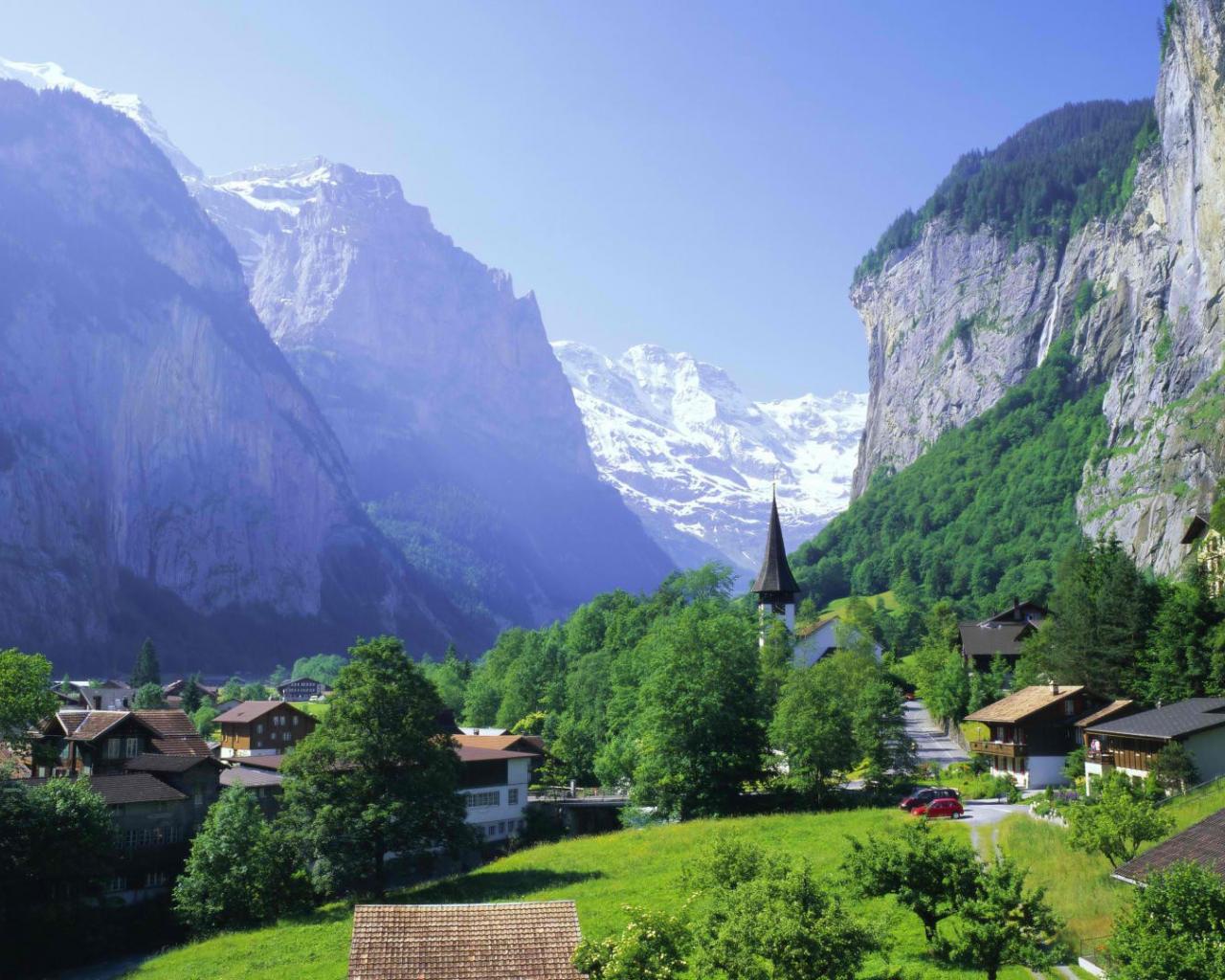 Обои Городок у подножия обрывистых скал