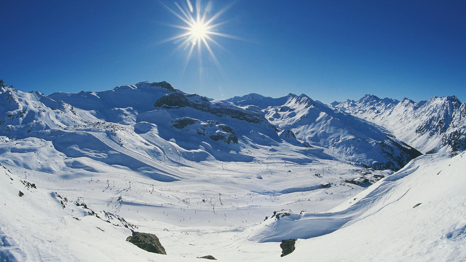 Обои Солнце в горах на горнолыжном курорте Ишгль, Австрия