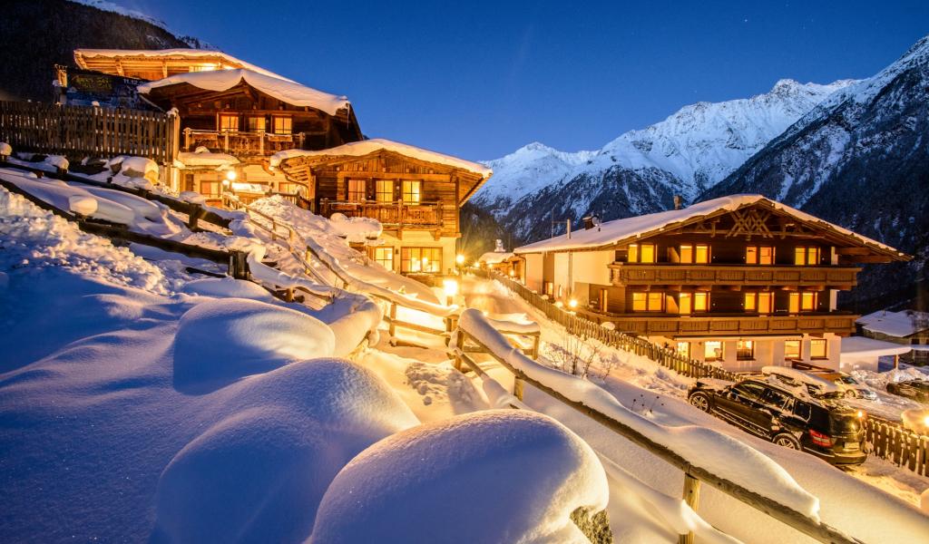 Обои Вечернее сияние на горнолыжном курорте Зёльден, Австрия