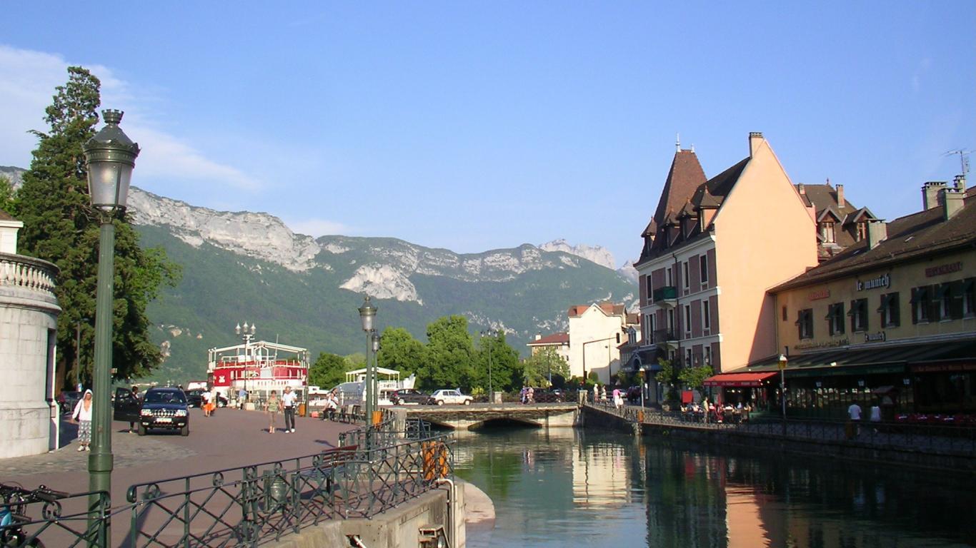 Обои Канал на фоне гор в городе Аннеси, Франция