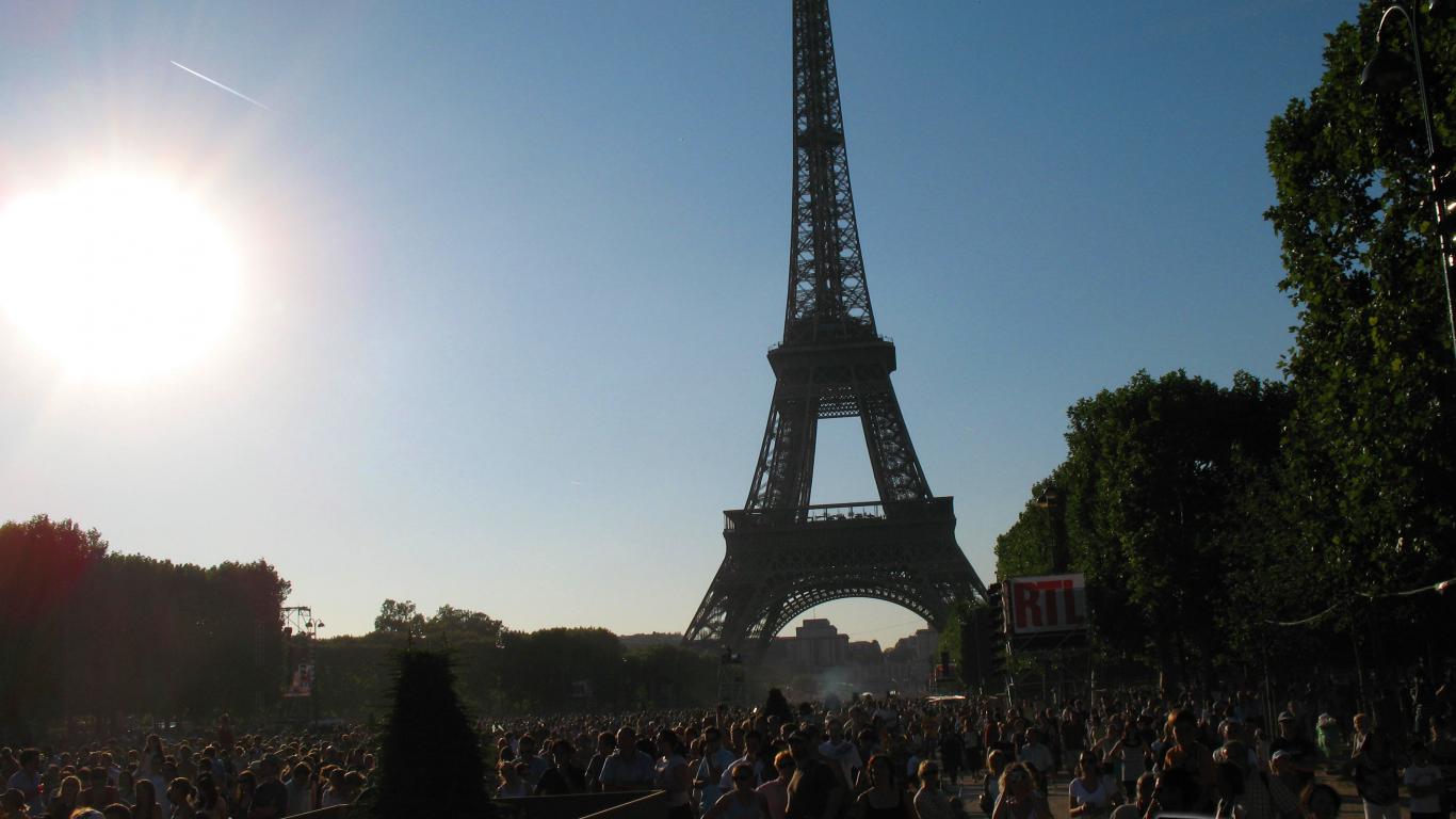 Обои Люди отдыхают возле Эйфелевой башни и фонтанов