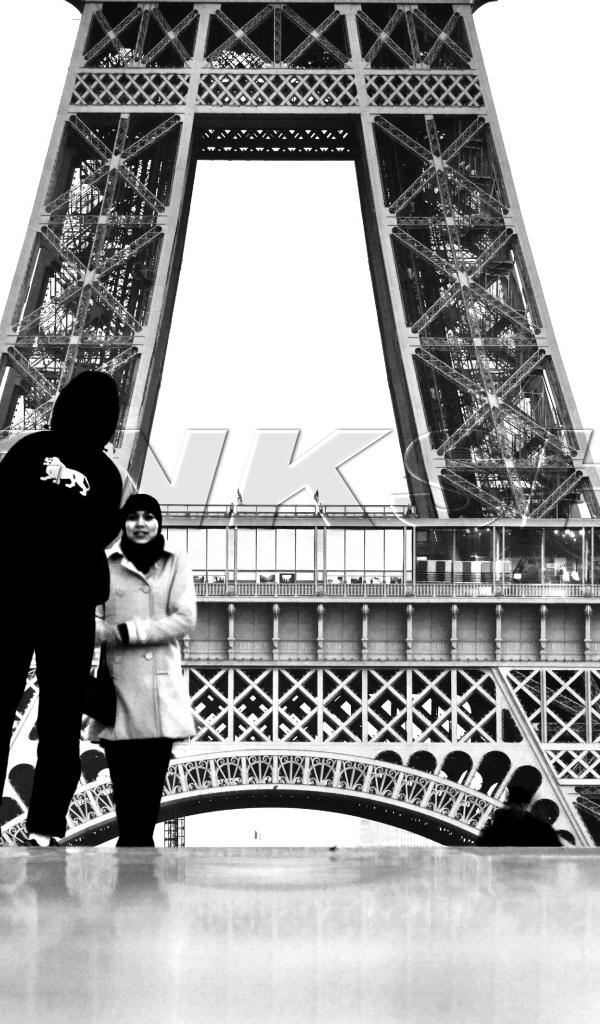 Обои Люди на фоне Эйфелевой башни, чёрно-белое фото
