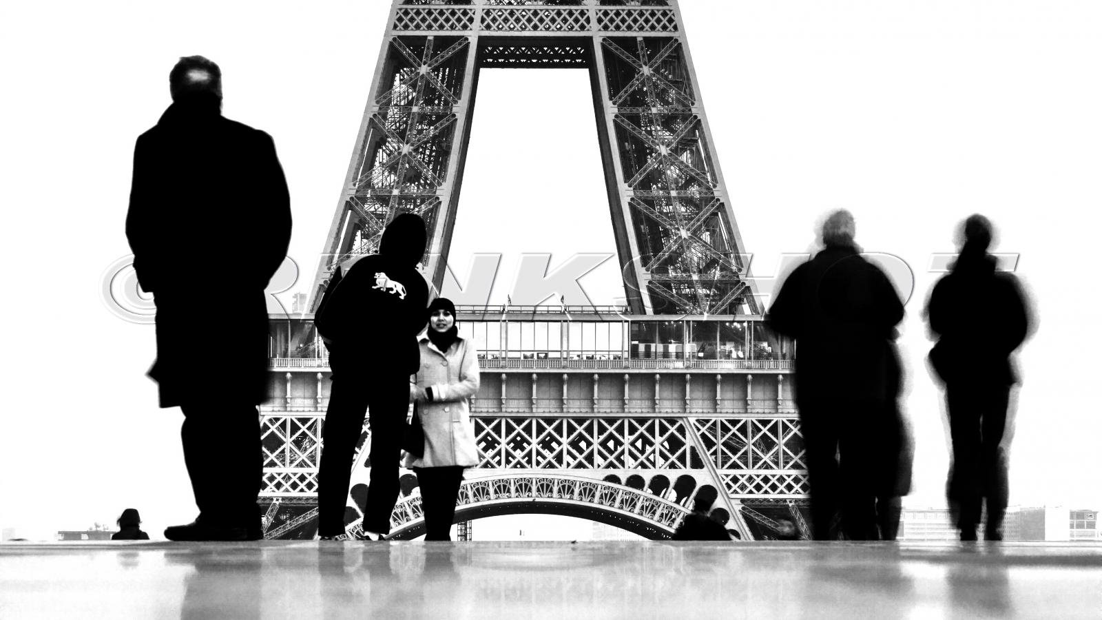 Обои Люди на фоне Эйфелевой башни, чёрно-белое фото