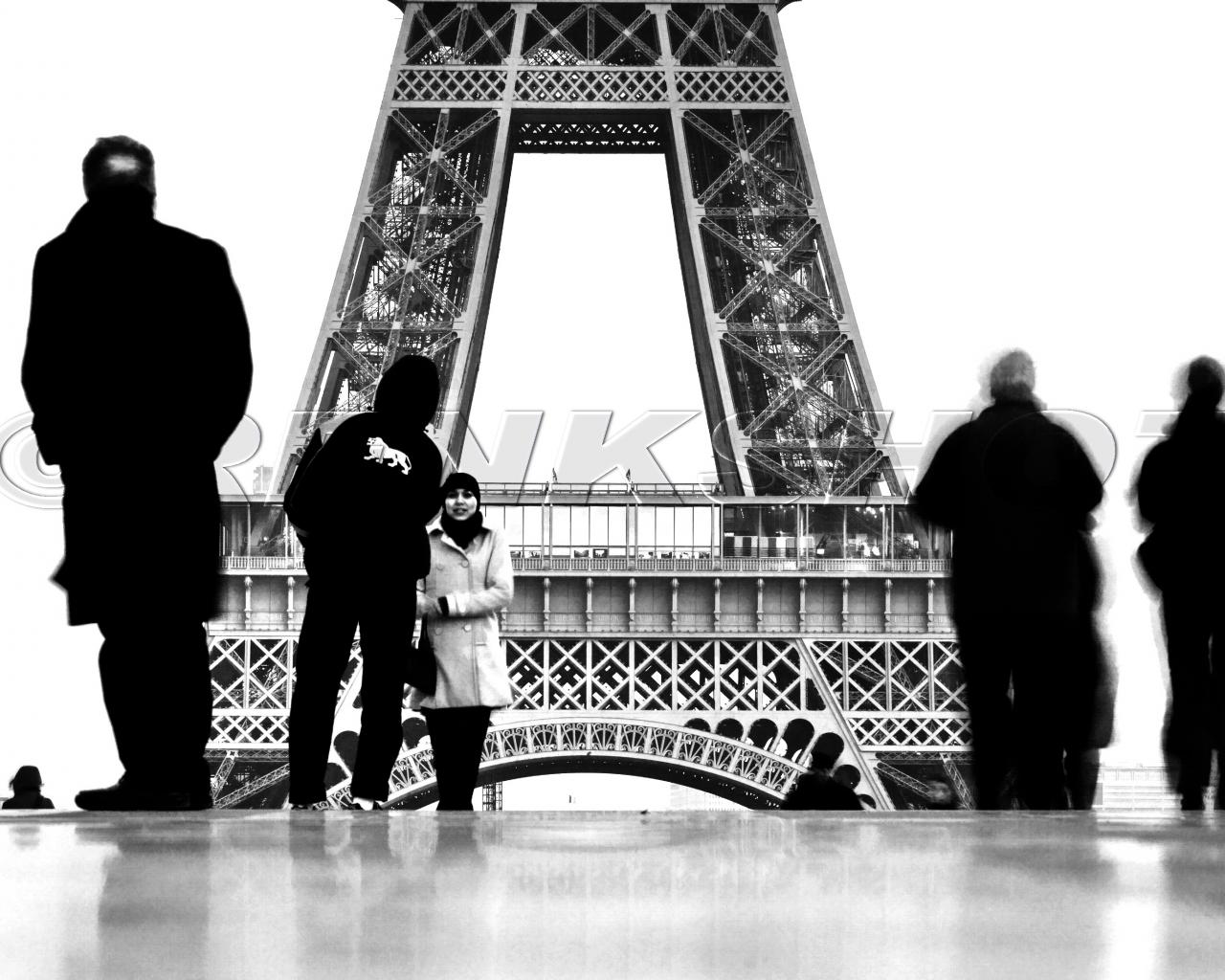 Обои Люди на фоне Эйфелевой башни, чёрно-белое фото