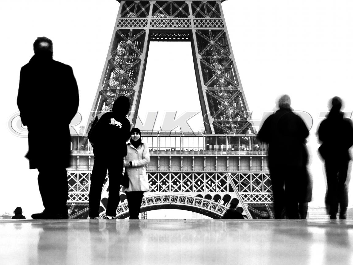 Обои Люди на фоне Эйфелевой башни, чёрно-белое фото