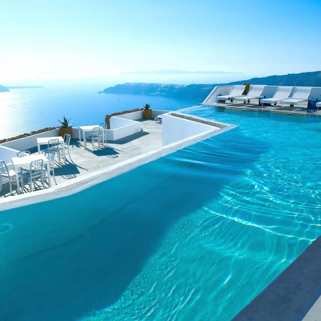 Обои Бассейн с видом на море, отель в Санторини Греция