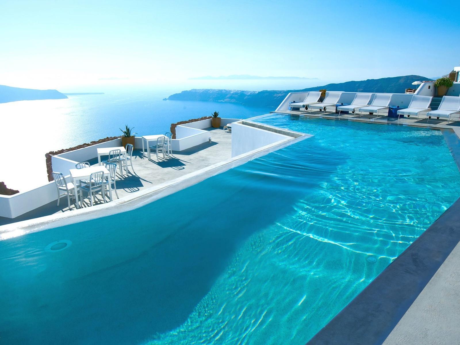 Обои Бассейн с видом на море, отель в Санторини Греция