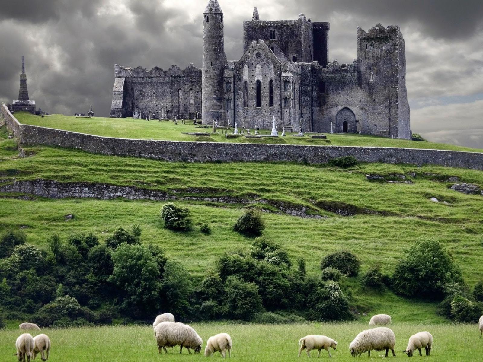 Обои Овцы на пастбище у замка в Ирландии