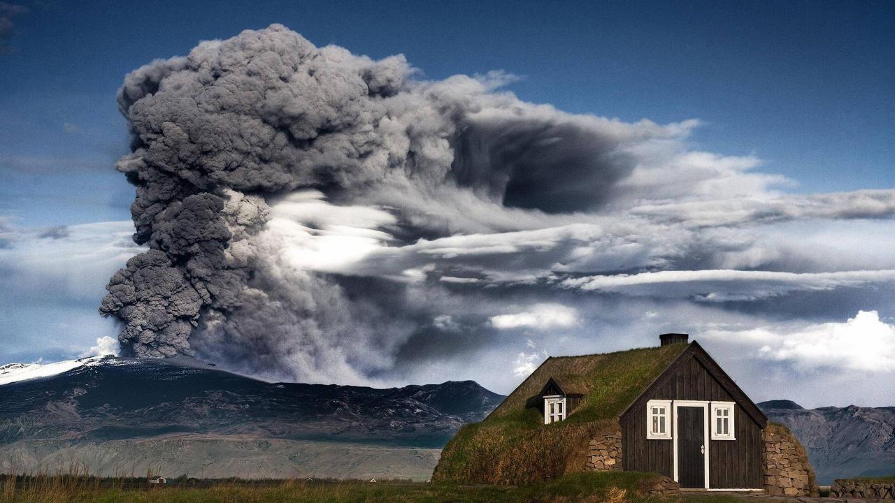 Обои Дом в Исландии на фоне извергающегося вулкана