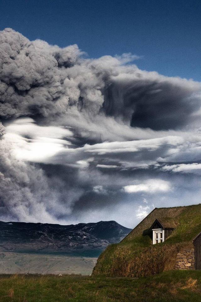 Обои Дом в Исландии на фоне извергающегося вулкана