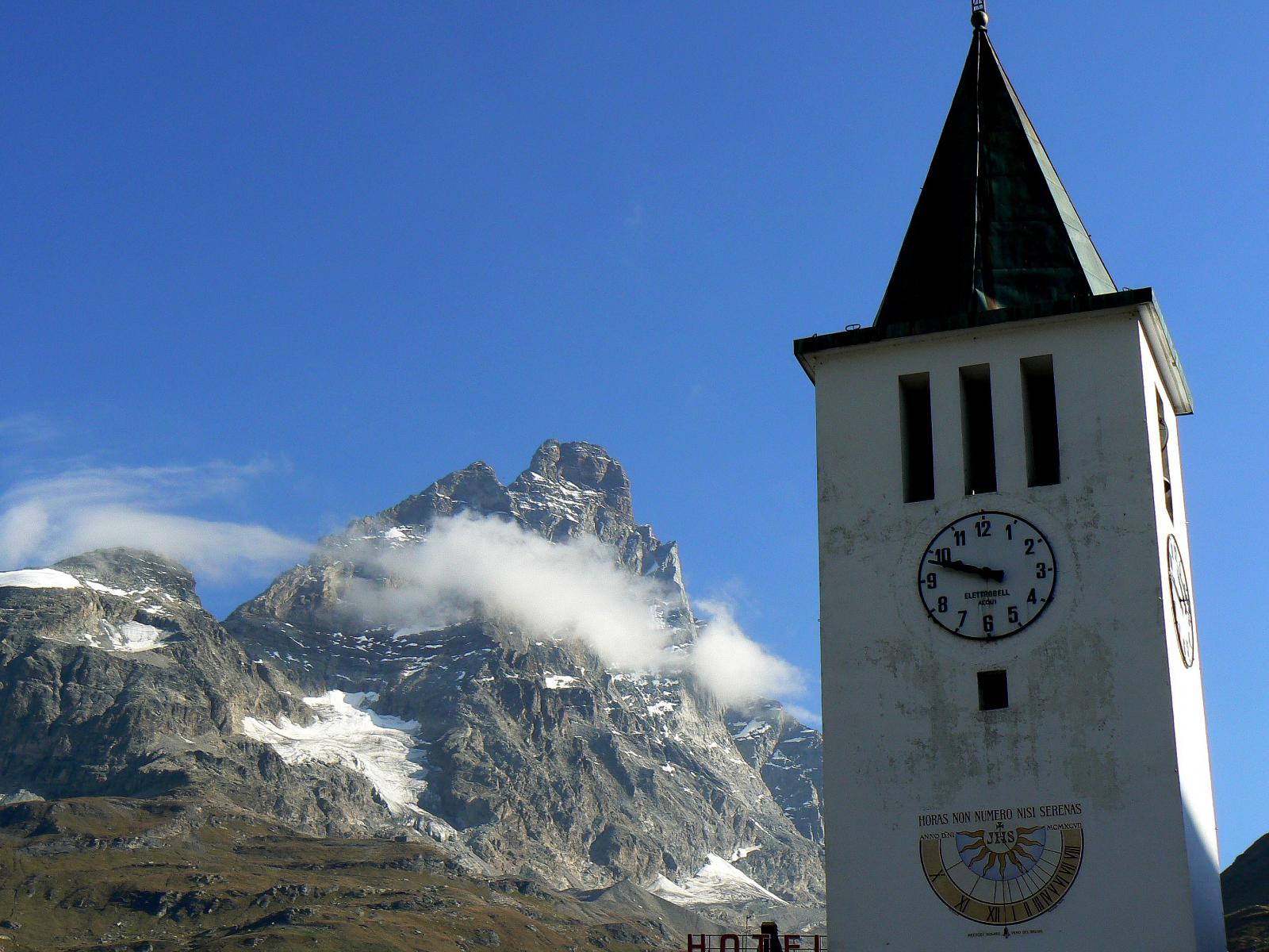 Обои Башня с часами на горнолыжном курорте Червиния, Италия