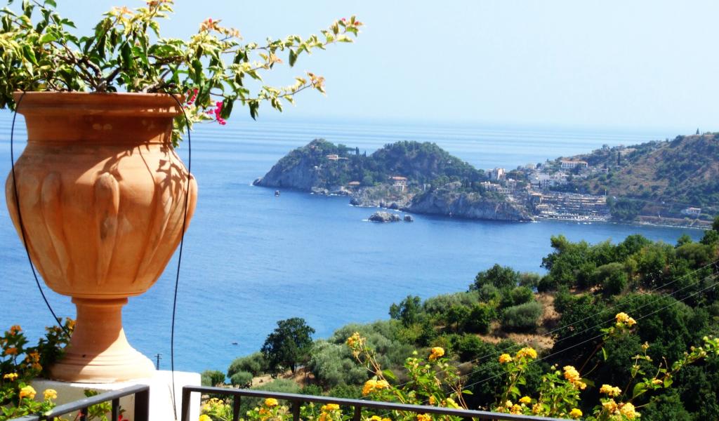Обои Кувшин с цветами на фоне залива на острове Сицилия, Италия
