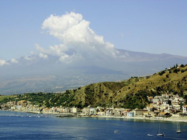 Обои Город на фоне вулкана Этна, на острове Сицилия, Италия