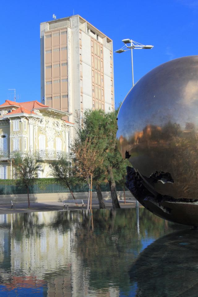 Обои Скульптура на фоне зданий на курорте Пизавр, Италия