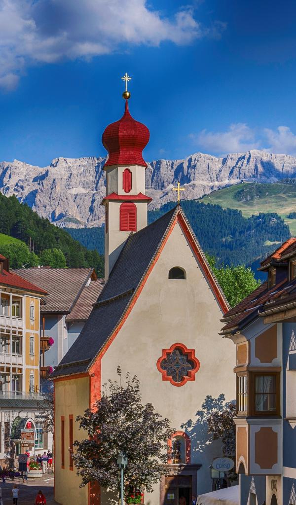 Обои Церковь на фоне гор на курорте Ортизей, Италия