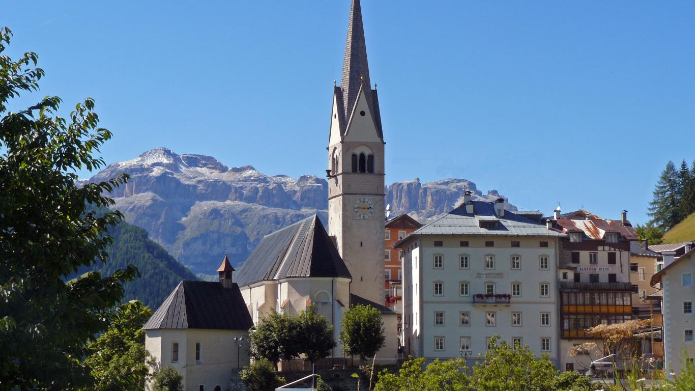 Обои Башня с часами на горнолыжном курорте Арабба, Италия