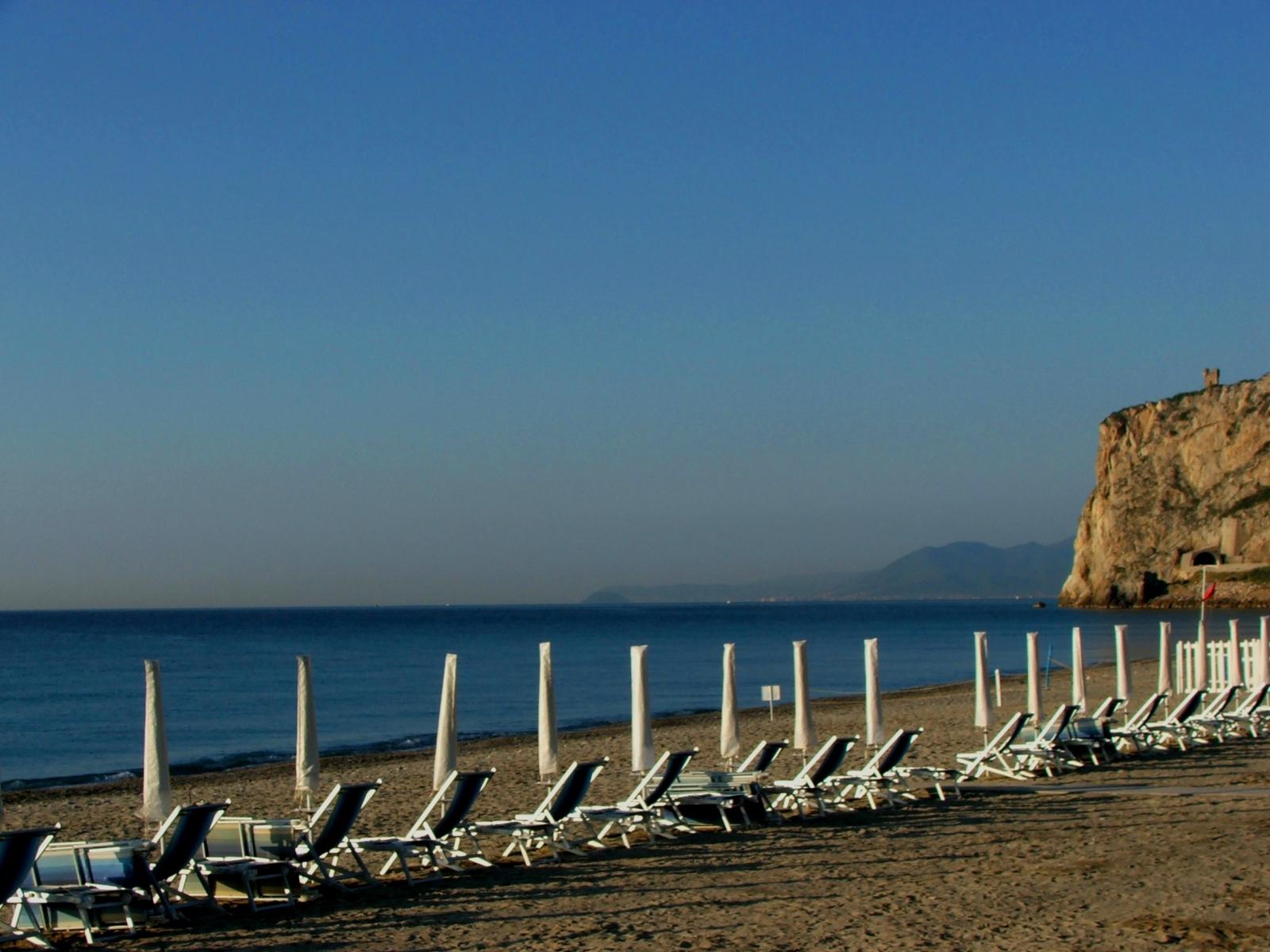 Обои Лежаки на пляже на курорте Финале Лигуре, Италия
