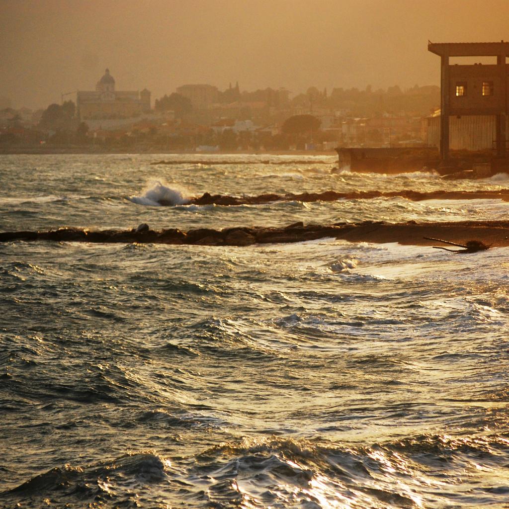 Обои Закат на пляже на курорте в Пьетра Лигуре, Италия