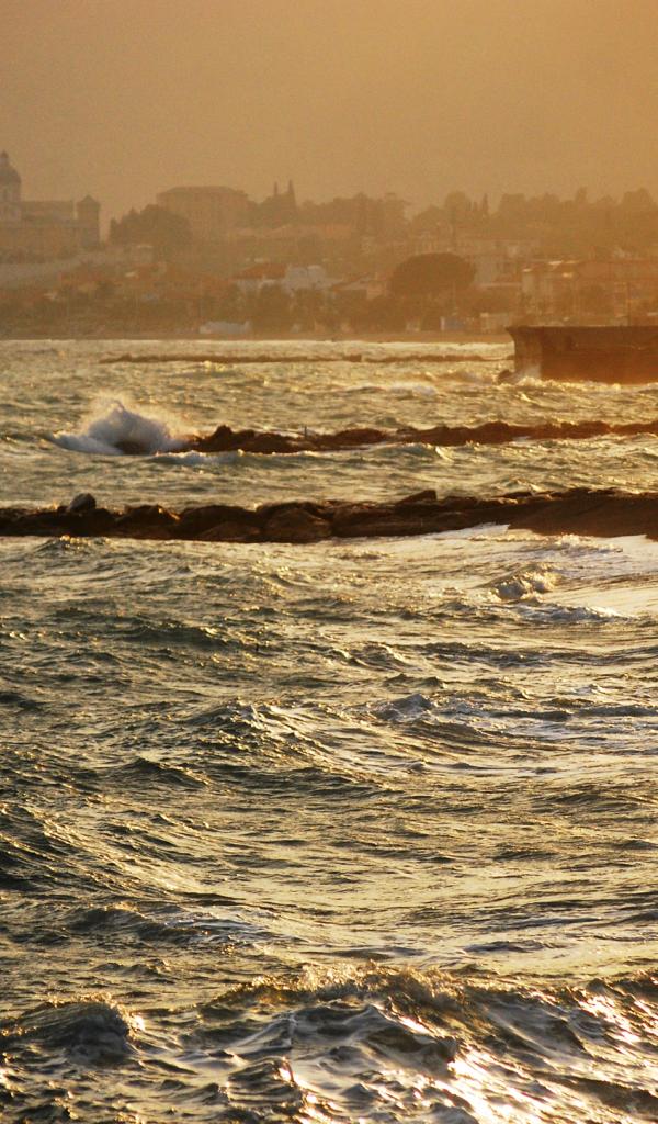 Обои Закат на пляже на курорте в Пьетра Лигуре, Италия