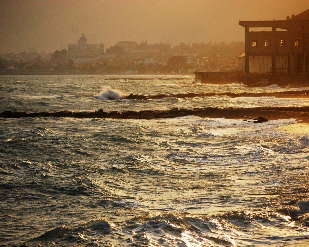Обои Закат на пляже на курорте в Пьетра Лигуре, Италия