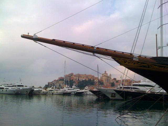 Обои Яхта на фоне города на курорте Империя, Италия