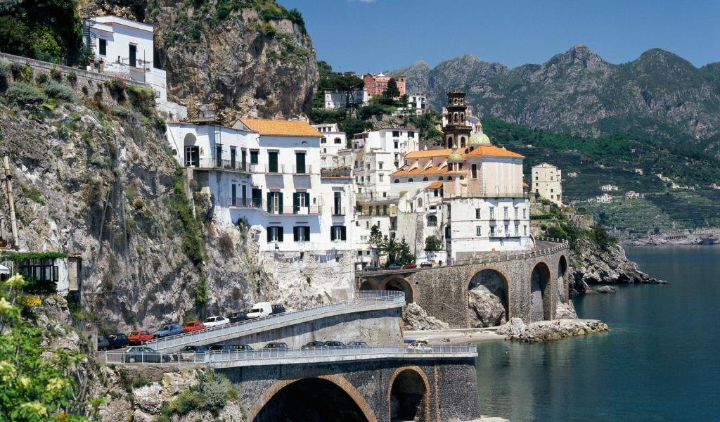 Обои Дома у подножия скалы на курорте в Римини, Италия