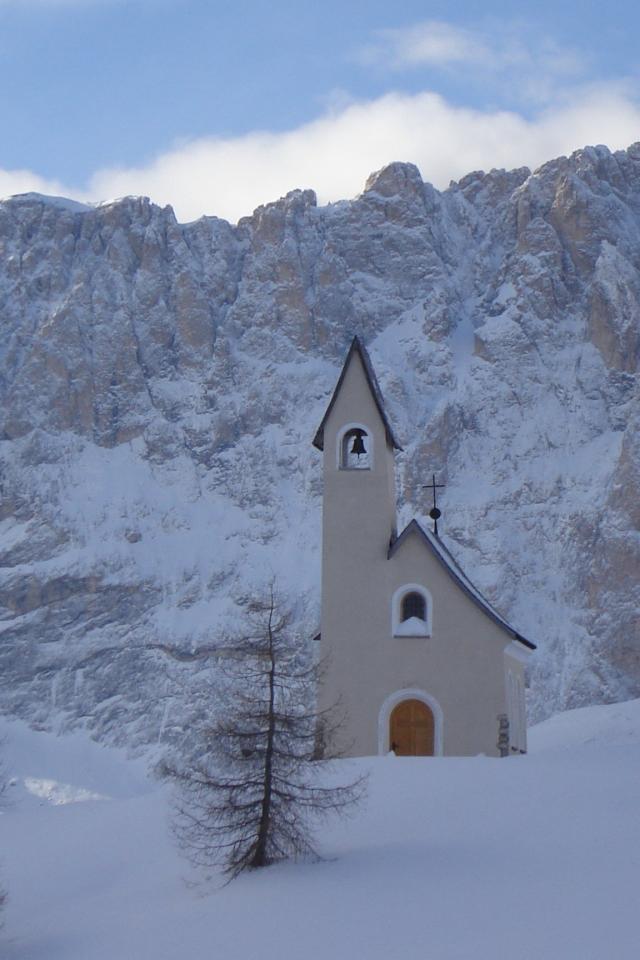 Обои Церковь на фоне Альп на горнолыжном курорте Валь Гардена, Италия