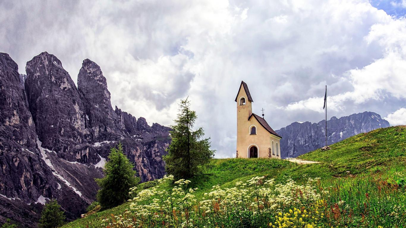 Обои Церковь на горнолыжном курорте Валь Гардена, Италия