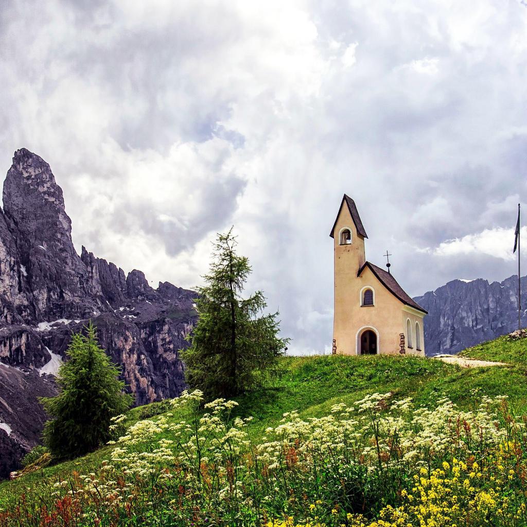 Обои Церковь на горнолыжном курорте Валь Гардена, Италия