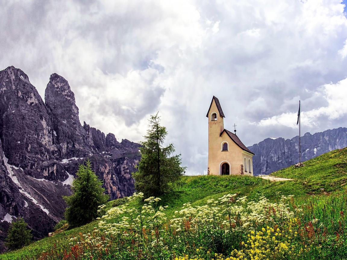Обои Церковь на горнолыжном курорте Валь Гардена, Италия