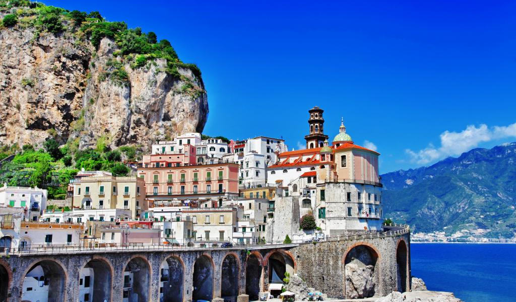 Обои Дома у подножия горы на курорте в Амальфи, Италия
