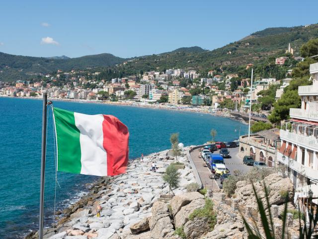 Обои Флаг на фоне пляжа на курорте Алассио, Италия