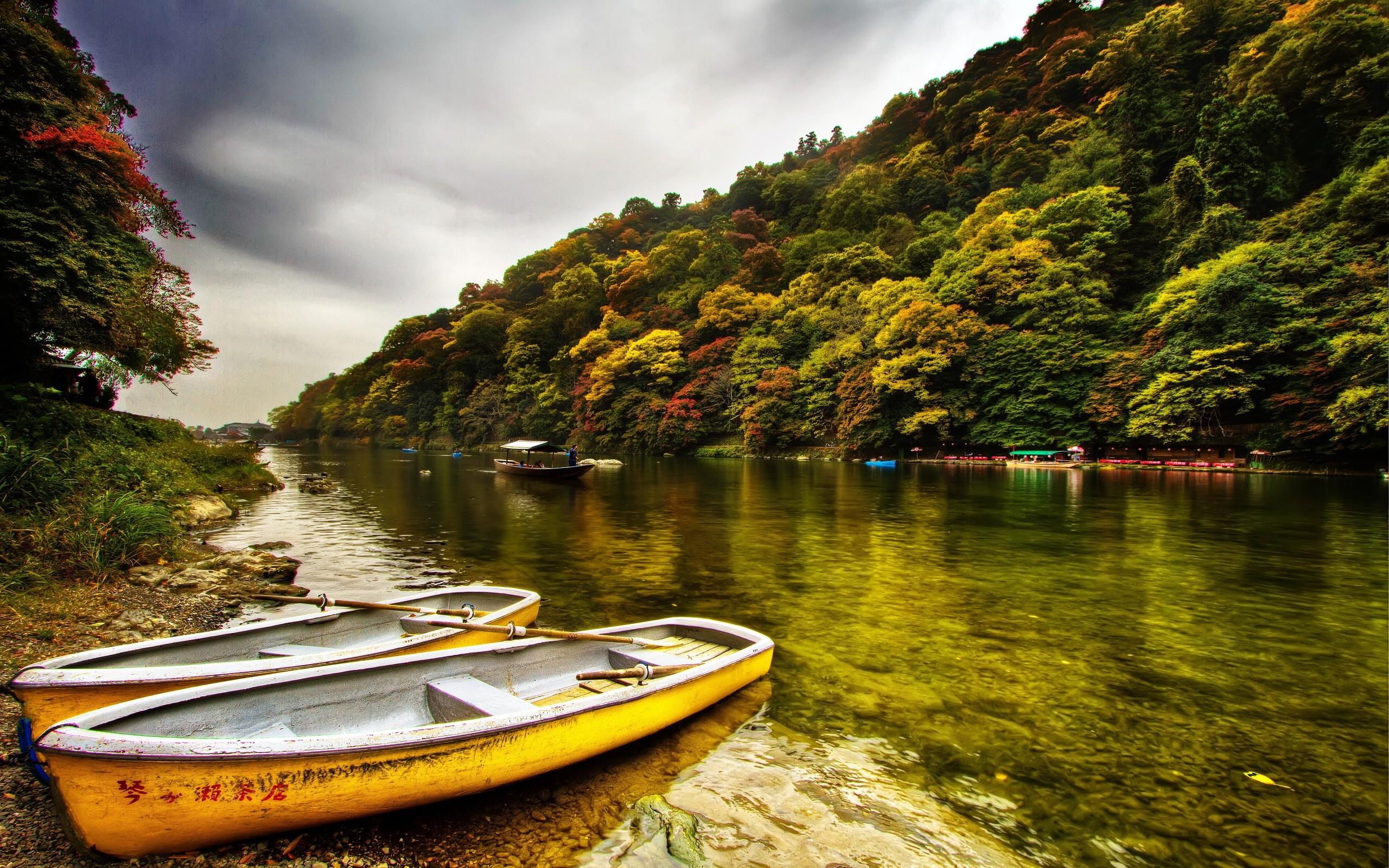 Обои Желтые лодки у берега реки в Китае