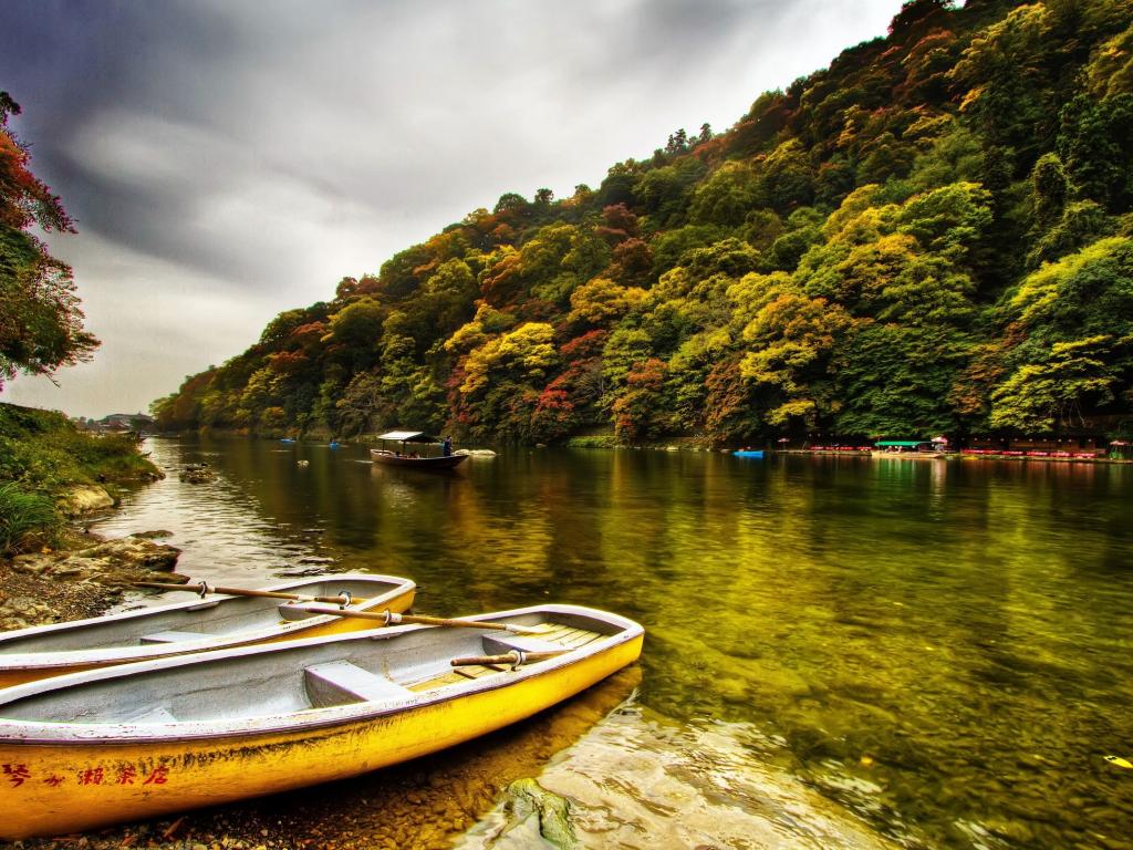 Обои Желтые лодки у берега реки в Китае