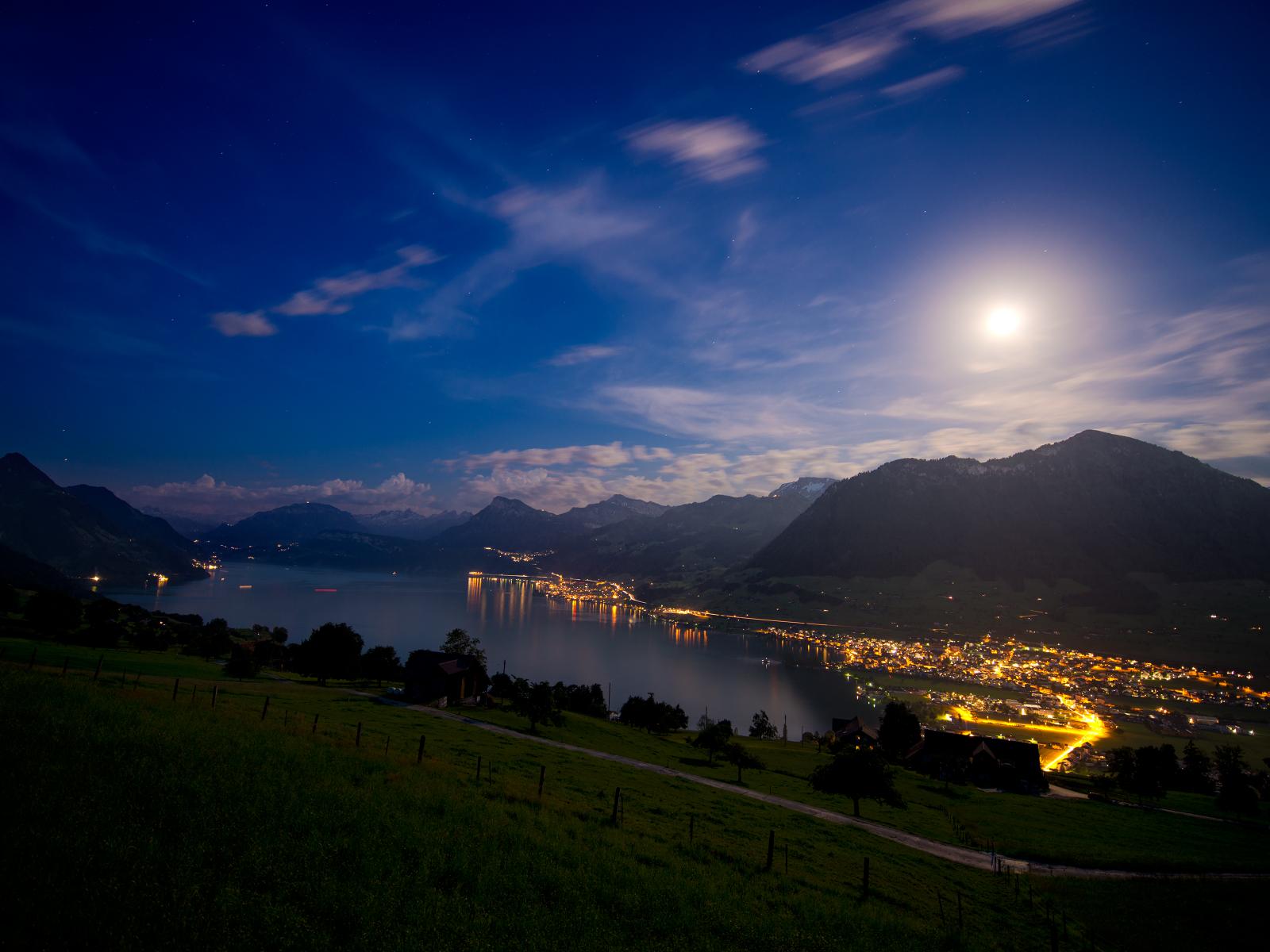 Обои Полнолуние над прибрежным городом, Швейцария
