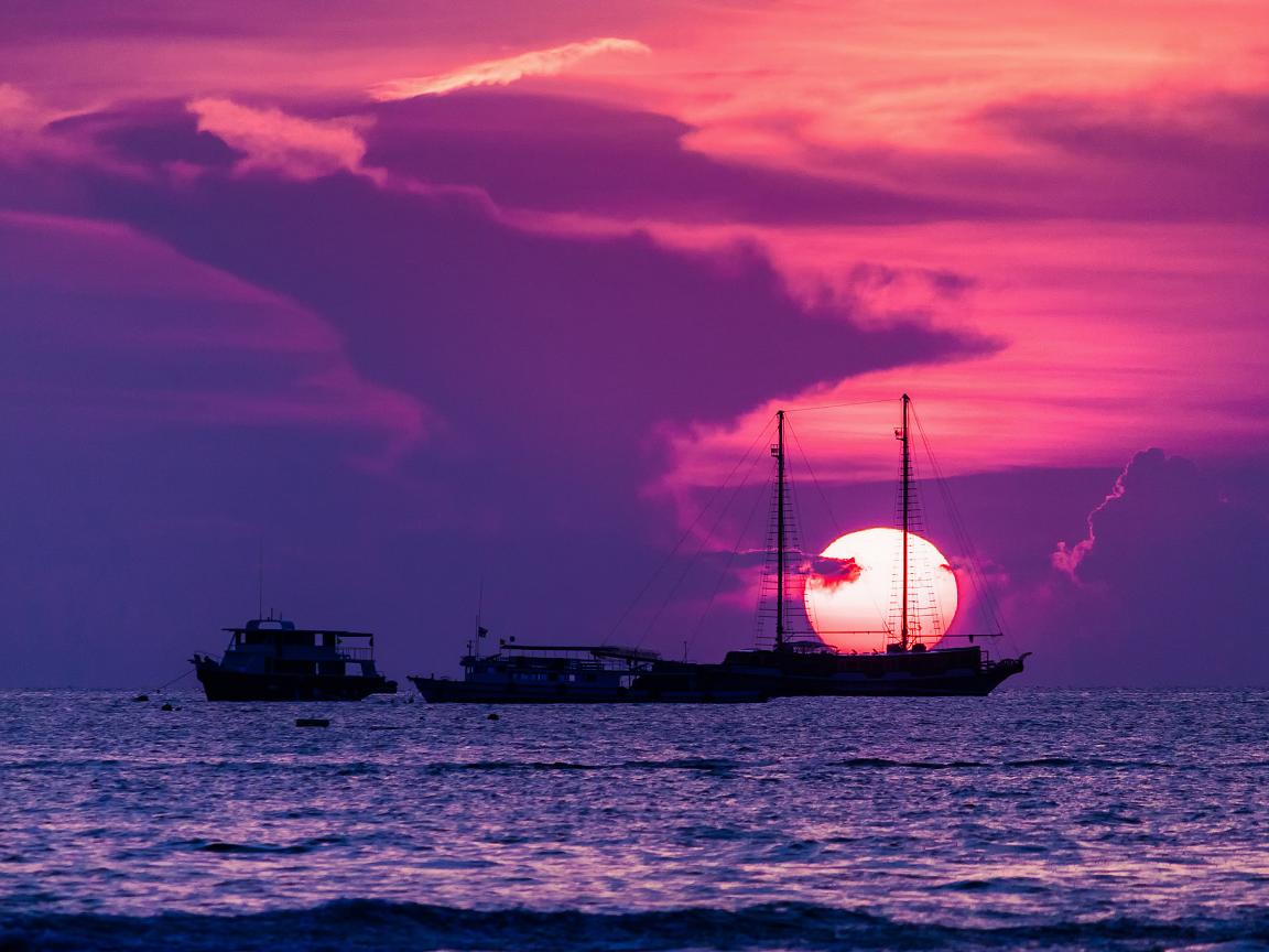 Обои Лодки на фоне заката на курорте в Паттайе, Таиланд