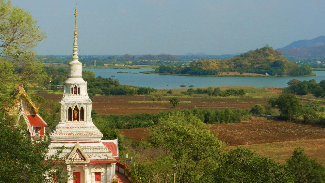 Обои Храм на фоне озера на курорте Лопбури, Таиланд
