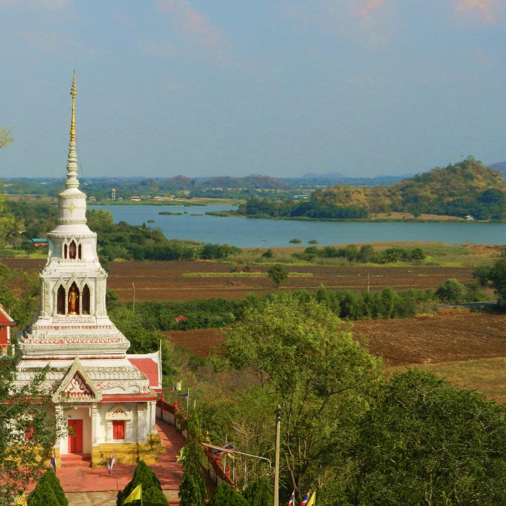 Обои Храм на фоне озера на курорте Лопбури, Таиланд