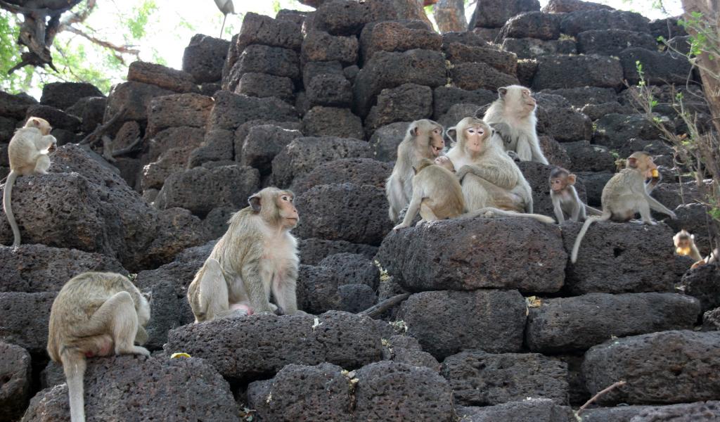 Обои Обезьяны на камнях на курорте Лопбури, Таиланд