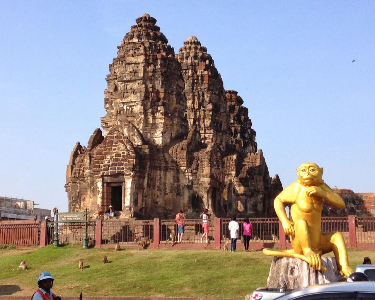 Обои Золотая обезьяна на фоне храма на курорте Лопбури, Таиланд