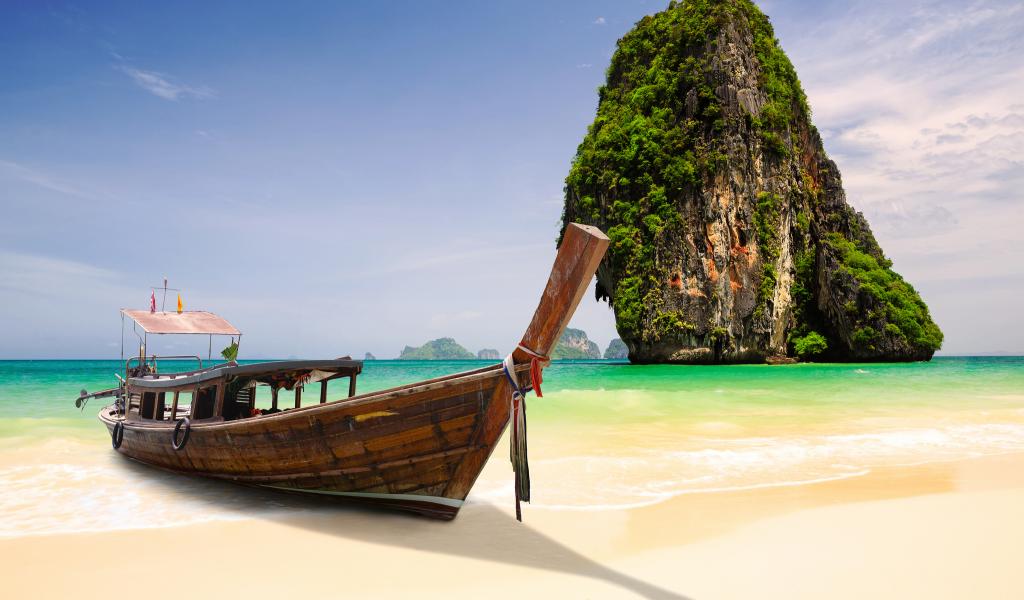 Обои Лодка на фоне скалы на курорте Краби, Таиланд