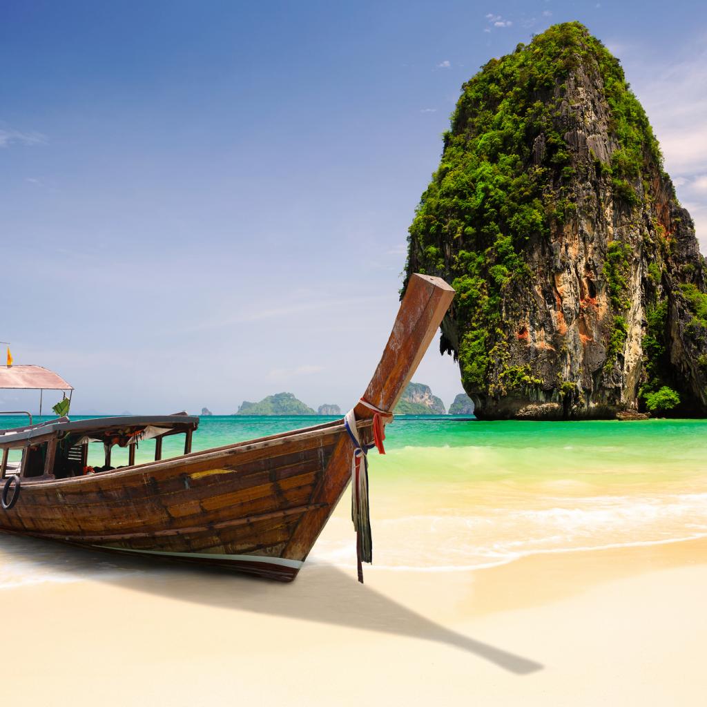 Обои Лодка на фоне скалы на курорте Краби, Таиланд