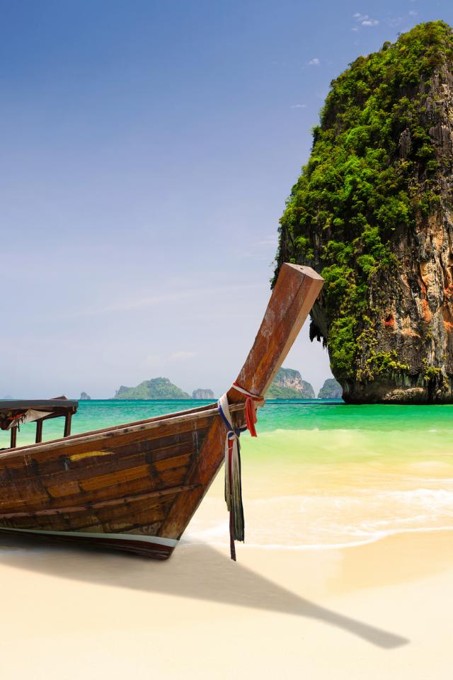Обои Лодка на фоне скалы на курорте Краби, Таиланд