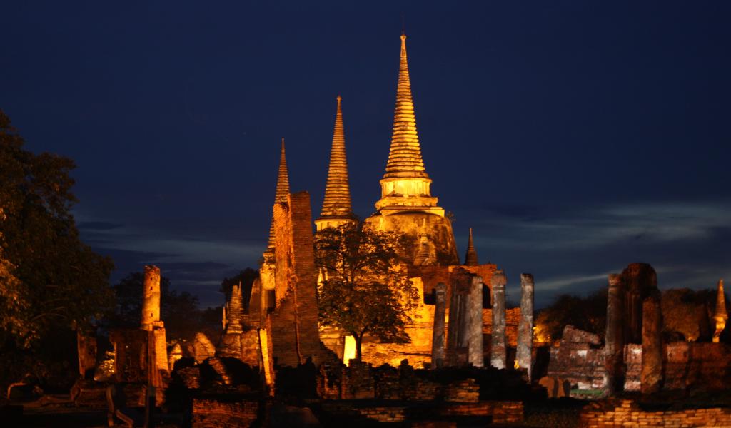 Обои Ночная подсветка храма на курорте Аютайя, Таиланд