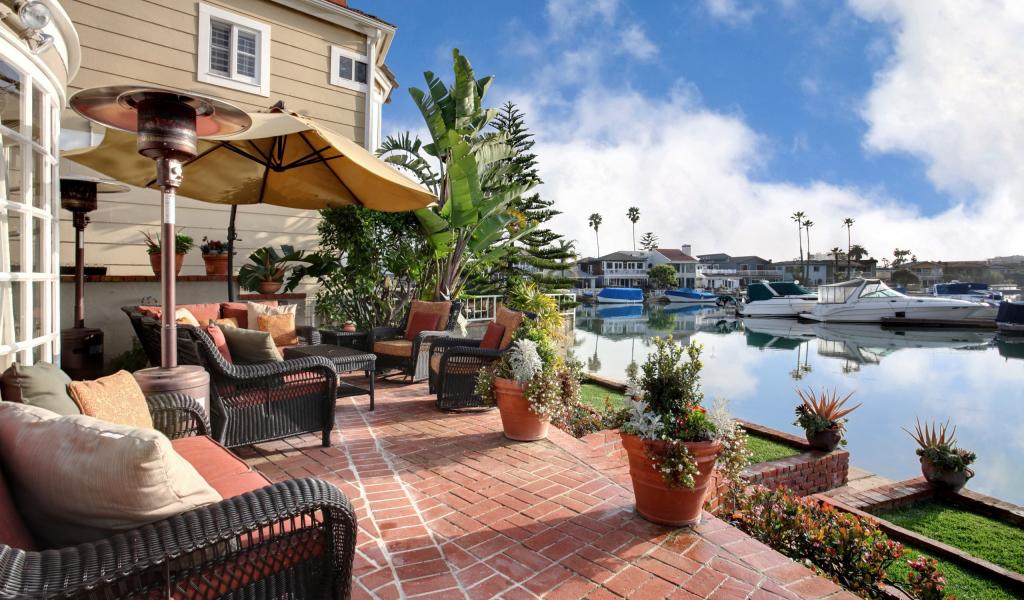 Обои Плетеные кресла и цветы в горшках у набережной