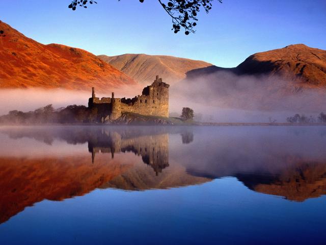 Обои Руины замка на берегу туманного озера