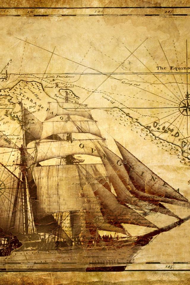 Обои Старинный корабль и карта мореплавателя